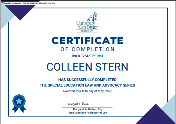 Colleen completed the Special Education Law Advocacy Series and learned from top special education attorneys of San Diego County, including Margaret Dalton Esq. and Matthew Story Esq. Colleen has attended over 100 IEP meetings for children of various ages and abilities.